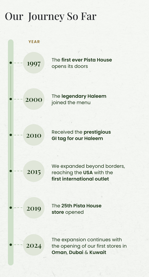 Since 1997, Pista House has been dedicated to honouring the essence of tradition through our food. What started as a small family endeavour has grown into a global culinary destination, known for preserving the true essence of Hyderabadi cuisine.